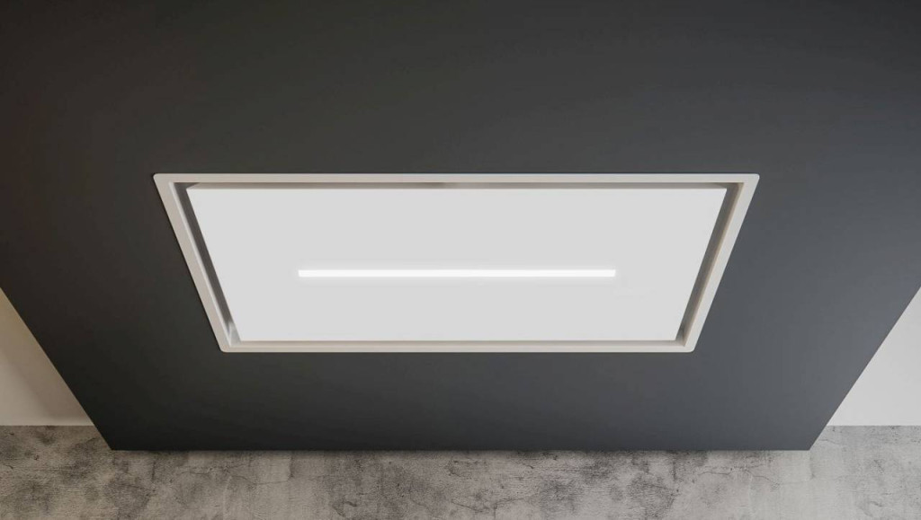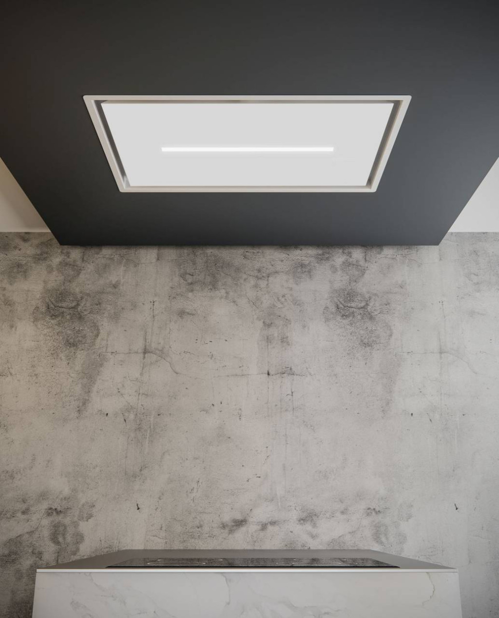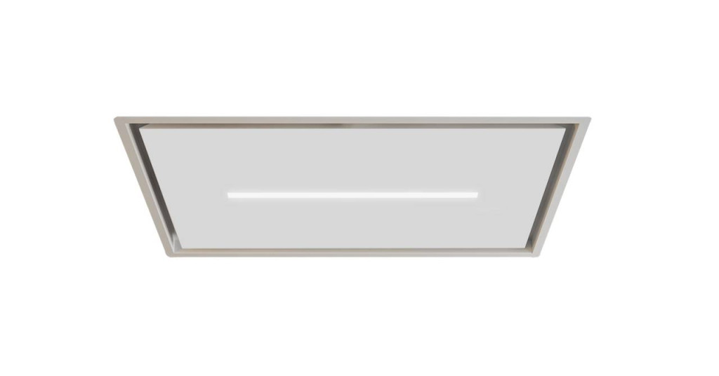 A SIRIUS SLT-971 LESS EM TW páraelszívó mennyezetbe építhető kivitele tökéletes választás azokba a modern konyhákba, ahol a tágas tér, a funkcionalitás és a letisztult forma harmóniája elsődleges szempont. A 120 cm széles készülékház elegánsan simul bele a mennyezeti síkba, miközben látványosan kiemeli a konyha magas színvonalú belsőépítészeti megoldásait. A fehérre festett rozsdamentes acél testet prémium fehér üveg panel koronázza meg, amely nemcsak látványos, hanem könnyen tisztán tartható is.