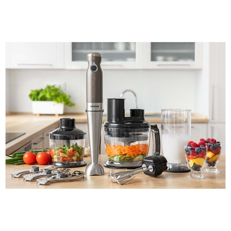 A Sencor SHB 5501CH-EUE3 botmixer krémlevesek, szószok, bébiételek gyors elkészítésében nyújthat Önnek segítséget. A 1200 W teljesítményű motor változtatható sebesség funkcióval lett ellátva. A Titanium Quad Blade Technológia alapján készült aprító pengék pedig forró ételek készítésére is alkalmasak. Az ergonomikusan kialakított markolat biztos és kényelmes fogást garantál. Az 800 ml-es fedeles keverőpohár segítségével nagy mennyiségű alapanyag is feldolgozható vagy akár mérőedényként is használható, továbbá megtalálható egy 500 ml kapacitású edény is, mely aprításra kiválóan használható.
