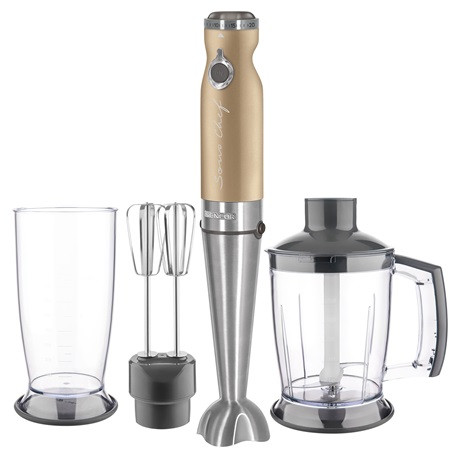 A Sencor SHB 5607CH botmixer krémlevesek, szószok, bébiételek gyors elkészítésében nyújthat Önnek segítséget. A 1200 W teljesítményű motor változtatható sebesség funkcióval lett ellátva. A Titanium Quad Blade Technológia alapján készült aprító pengék pedig forró ételek készítésére is alkalmasak. Az ergonomikusan kialakított markolat biztos és kényelmes fogást garantál. Az 800 ml-es fedeles keverőpohár segítségével nagy mennyiségű alapanyag is feldolgozható vagy akár mérőedényként is használható, továbbá megtalálható egy 1250 ml kapacitású edény is, mely aprításra kiválóan használható.