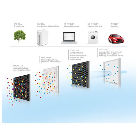 - UV-C sugárzás: elpusztítja a mikroorganizmusokat, baktériumokat, vírusokat és a penészgombákat (valamint az általuk kibocsátott toxikus anyagokat)
