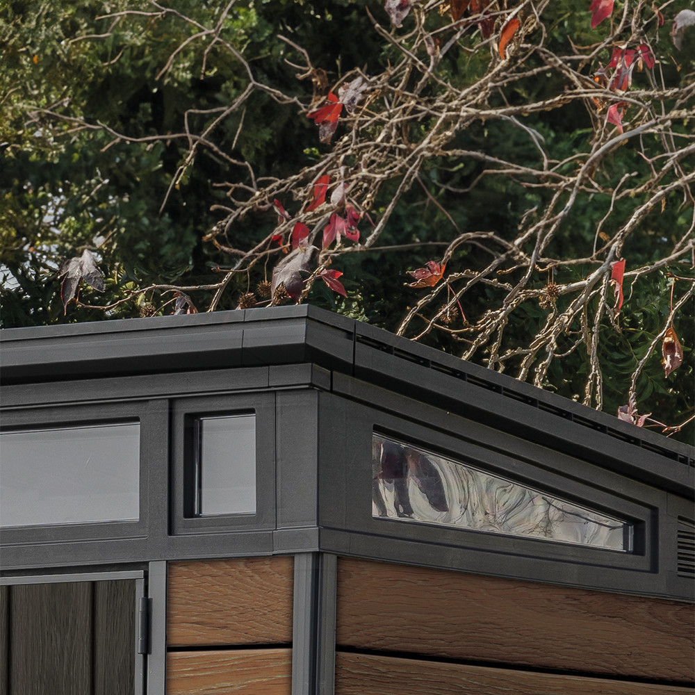 • Modern dizájn és elegáns megjelenés: A Signature PENT 7X7 ház kialakítása minden kertben vagy udvarban jól mutat, hiszen a valódi fára emlékeztető textúra és a ferde tetős megoldás elegáns, modern külsőt biztosít. A kis ablakok nemcsak stílust adnak, hanem természetes fényt is biztosítanak a belső tér számára.