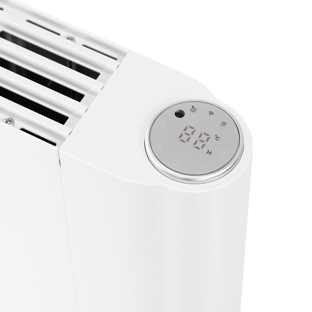 A túlmelegedés elleni védelem megbízható működést garantál, az IP24-es védettség pedig lehetővé teszi a készülék használatát akár fürdőszobában is. A felső részbe süllyesztett, kör alakú digitális vezérlőpanel egyszerű és áttekinthető kezelést biztosít: a kijelző mutatja a beállított hőfokot, míg a körkörös ikonok a funkciók állapotát jelzik.