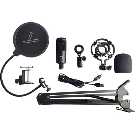 A készlet tartalmaz egy pop filtert, rezgéscsillapító tartót, szélvédőt, állítható stúdióállványt és USB-B - USB-A kábelt.