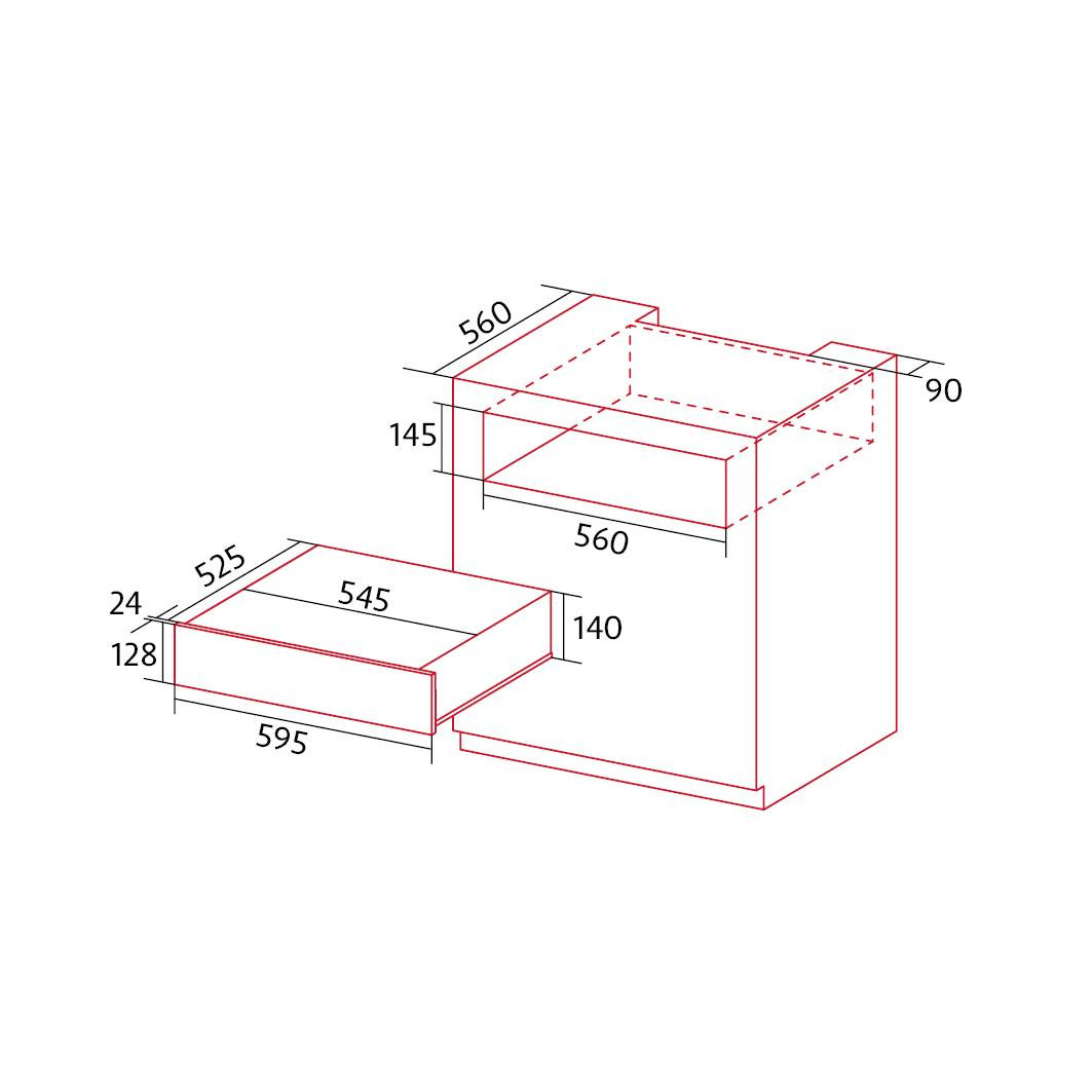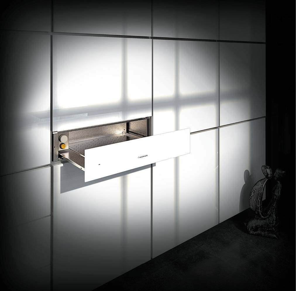 20 literes melegentartó fiók, fekete üvegajtó Npush nyítással, teleszkópos sínnel, csúszásmentes fiókbetéttel, 36 tányér vagy 80 csésze kapacitás, szabályozható hőmérséklet: 30º és 75ºC között, melegentartás, felolvasztás, joghurt készítés, főzés alacsony hőmérsékleten.