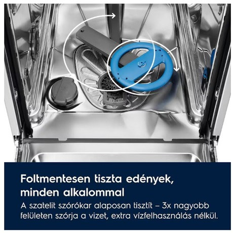 Az edények makulátlanul tisztán kerülnek elő a SatelliteClean® mosogatógépből – akár 3x jobban teljesít, mint a hagyományos mosogatógép. Duplán forgó karja folyamatosan változtatja a permetezés szögét, így még a terjedelmesebb edényeket is alaposan megtisztítja.