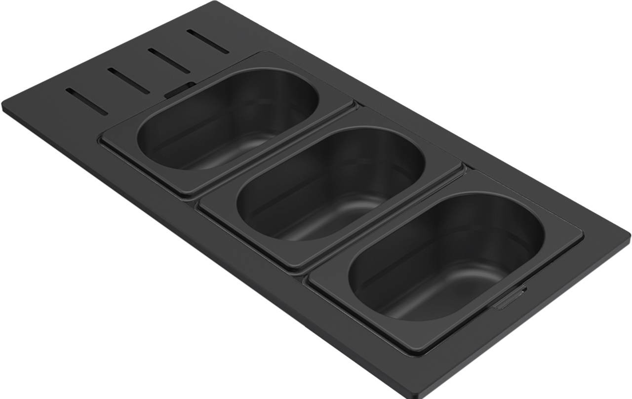 A három különálló rekesz ideális megoldást kínál az alapanyagok, fűszerek vagy kisebb konyhai eszközök higiénikus és átlátható tárolására. A tárolóedény szettet kifejezetten az Elleci Sintesi mosogatókhoz tervezték, garantálva a tökéletes illeszkedést és az egységes, letisztult vizuális összhatást.