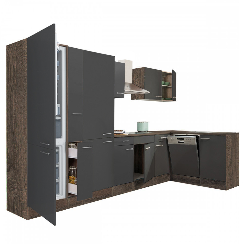 Yorki 370 sarok konyhabútor yorki tölgy korpusz,selyemfényű antracit fronttal polcos szekrénnyel és alulfagyasztós hűtős szekrénnyel